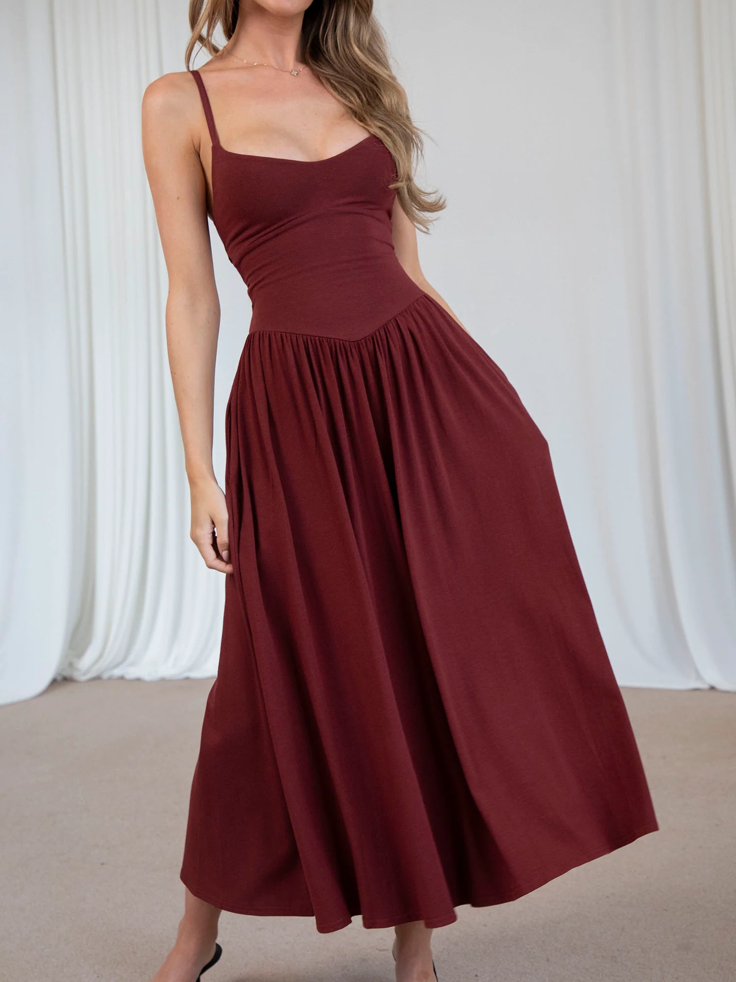 Designed with a flattering subtle basque waist and full, floaty skirt, Cammie lets you move with grace and ease. The soft, double-layered stretch fabric is smoothing and comfortable, and the corset-style waist ties allow you to personalise the fit. Delicate, adjustable straps offer just the right amount of support, plus there’s the option to add discreet bra cup inserts. And, of course, she has pockets - because every great dress should.