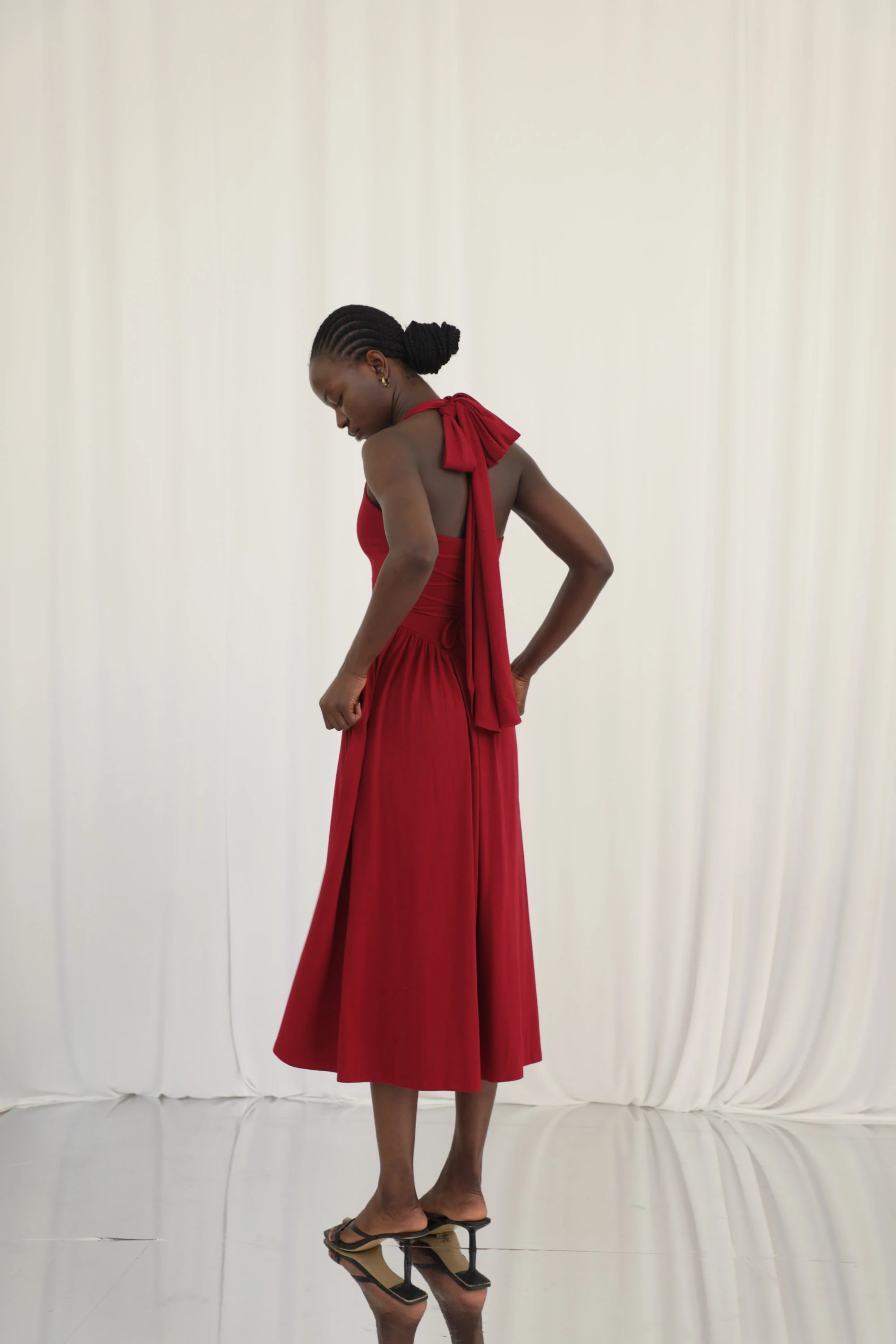 Our signature double-layered stretch fabric hugs your body comfortably through the bodice before flowing into a full, floaty midaxi-length skirt. The subtle basque waist and corset ties softly define your silhouette and make it easy to adjust the fit. Wide, adjustable halterneck ties invite you to style Cleo your way - knotted in a statement bow or crossed at the front for a modern twist. She’s a dress you’ll reach for again and again.