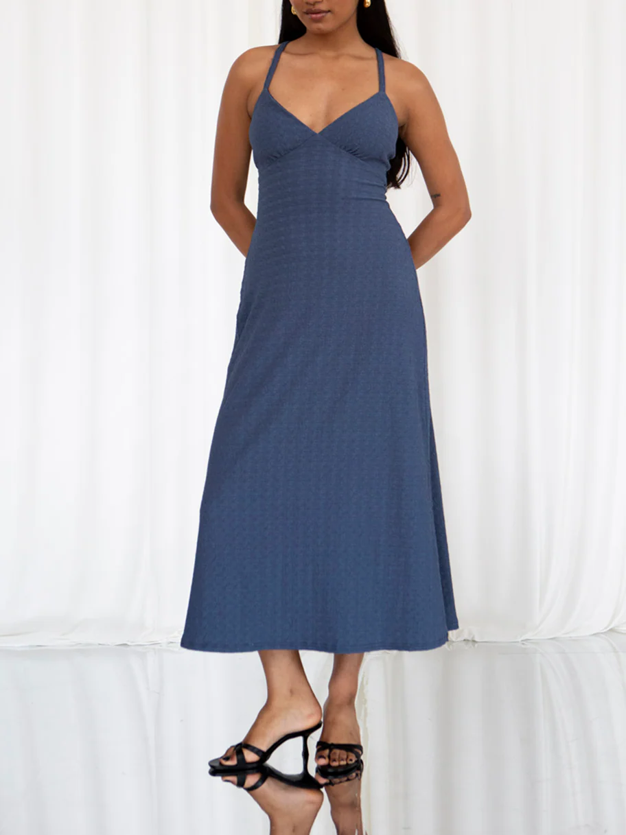 Elevate your wardrobe with our Dawn Dress, a classic strappy midi dress crafted from soft recycled fabric. This dress features an elegant open back and adjustable straps that tie in a gorgeous style to the back. The eye-catching textured fabric imbues this piece with depth and sophistication, making it a standout choice.